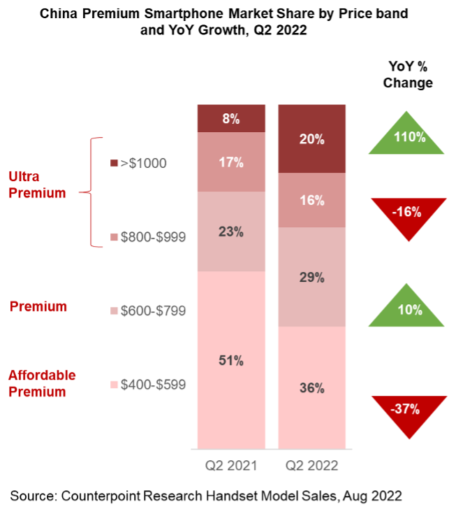 按价格段分类的我国高端智能手机商场比例及 2022年Q2 同比增加