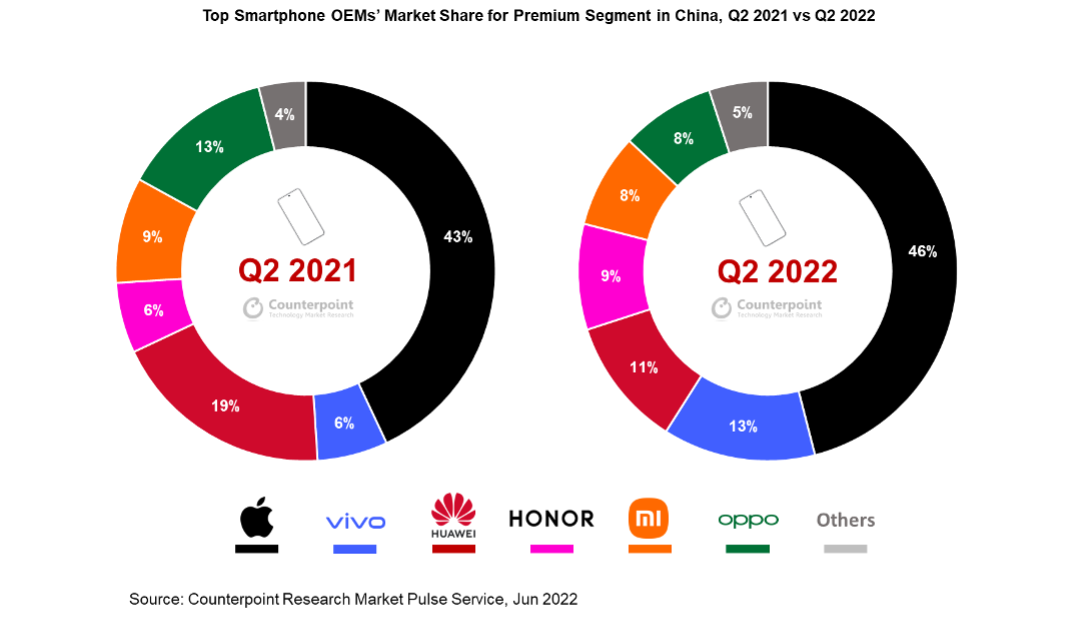 2022 年第二季度,前六大 OEM 占有了整个高端商场 95% 的比例。与此一起,vivo 销量同比增加 91%,替代了华为初次在我国高端商场占有第二位。