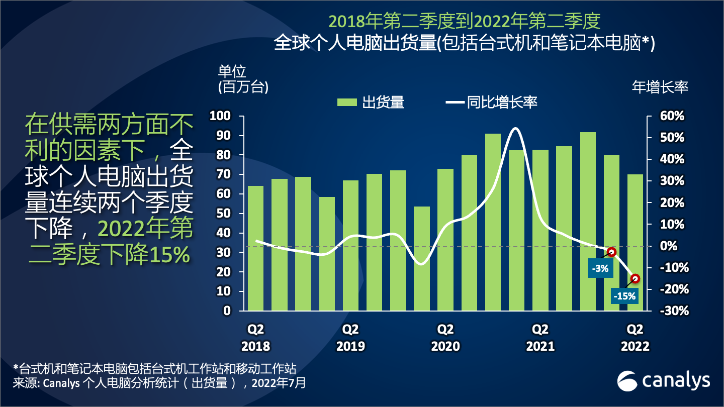 2022 年第二季度,因为我国针对新冠疫情采取了封控办法,使得出产中止,对 PC 商场带来了严峻影响。依据Canalys 发布的最新数据,台式机和笔记本电脑的总出货量为 7020 万台,年均下降 15.0%,这也是自 2020 年第一季度初次疫情封控以来的最低销量。全球多个最大规划的 PC 商场面对巨大通胀压力,现在仍未得到有用遏止,导致需求受挫,来自消费范畴的需求下滑特别显着。在 2022 年第二季度,因为教育收购比较上一年同期持续低迷,笔记本电脑接连第三个季度呈现下滑,出货量下降 18.6% 至 5450 万台。比较之下,因为各国加大敞开力度,商业需求微弱,影响了台式机的更新和晋级,出货小幅添加 0.6% 至 1560 万台,尽管未来全球宏观经济面对严峻的压力,但高端商用范畴仍将是本年全体 PC 商场的开展亮点。