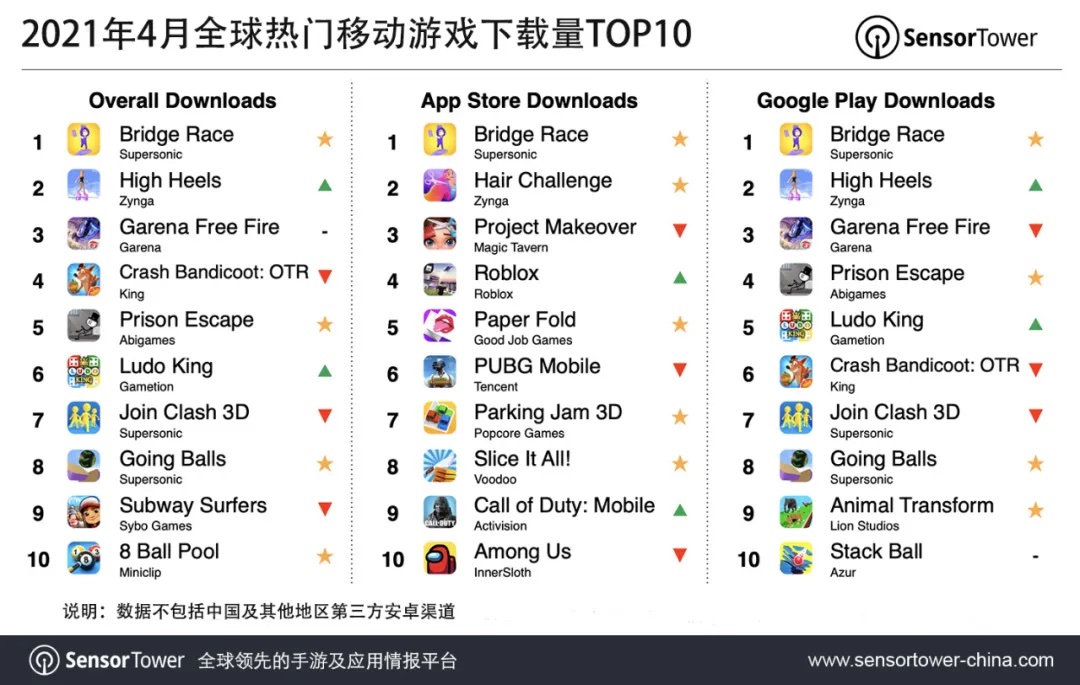 ,Supersonic《Bridge Race》4月在全球App Store和Google Play取得2800万次下载,位列全球移动游戏下载榜榜首。印度是该游戏榜首大商场,贡献了15.5%的下载量;其次是美国,占11.4%。