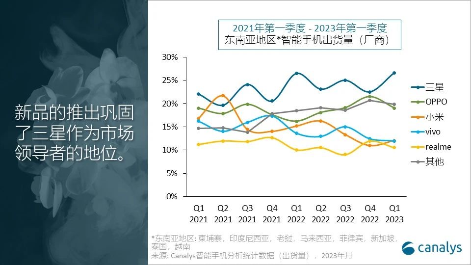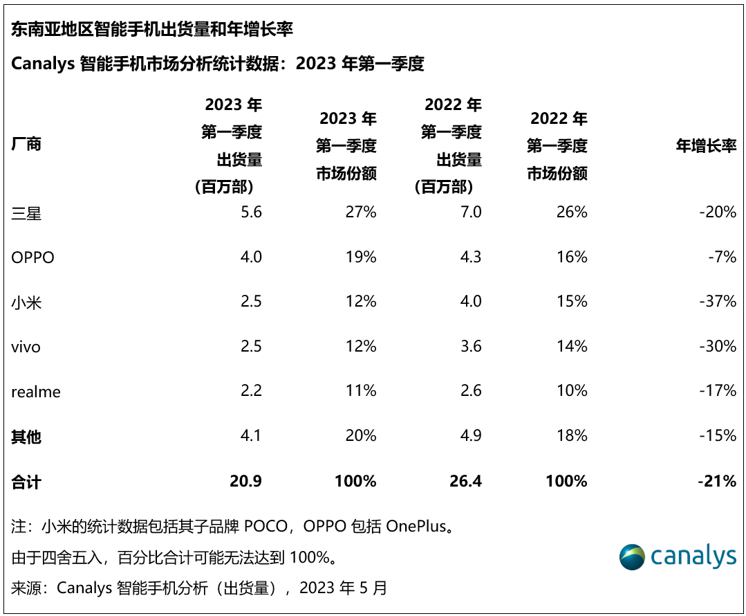 依据Canalys发布的最新数据,2023年第一季度,东南亚区域智能手机商场同比下降 21%,出货量跌至 2090 万部。因为顾客在财政上坚持慎重情绪,削减在消费电子产品方面的开销,因而继前四个季度后,东南亚阅历了又一季度下滑。因为各个价位新机型的商场反应杰出,三星得以扩展其抢先优势,出货量到达560 万部,商场份额为 27%。OPPO以 400 万部的出货量位居第二,商场份额为 19%。该品牌主打 150 美元至 200 美元价格规模的机型,其间更是以A系列产品占有了商场主导位置。小米和vivo旗鼓相当,各自出货量均到达250 万部,小米的排名也得以攀升至第四位。realme则以220 万部的出货量及11%的商场份额跻身前五。
