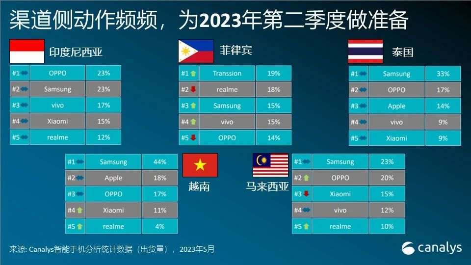 Canalys分析师Chiew Le Xuan表明:“各品牌都期望3-4月的节日活动以及新品的推出能激起顾客购机需求,但这未能到达预期。智能手机厂商在曩昔几个季度进行了库存调整,预备使用印尼和马来西亚的斋月节以及泰国推举期间的消费升温,以推进销量添加。虽然与去年比较吸引力有所下降,但苹果和三星拓宽了途径活动,然后添加零售途径流量并进步品牌知名度。其他我国厂商期望仿效OPPO的成功战略,逐步进步价格区间,以提高其品牌形象。”