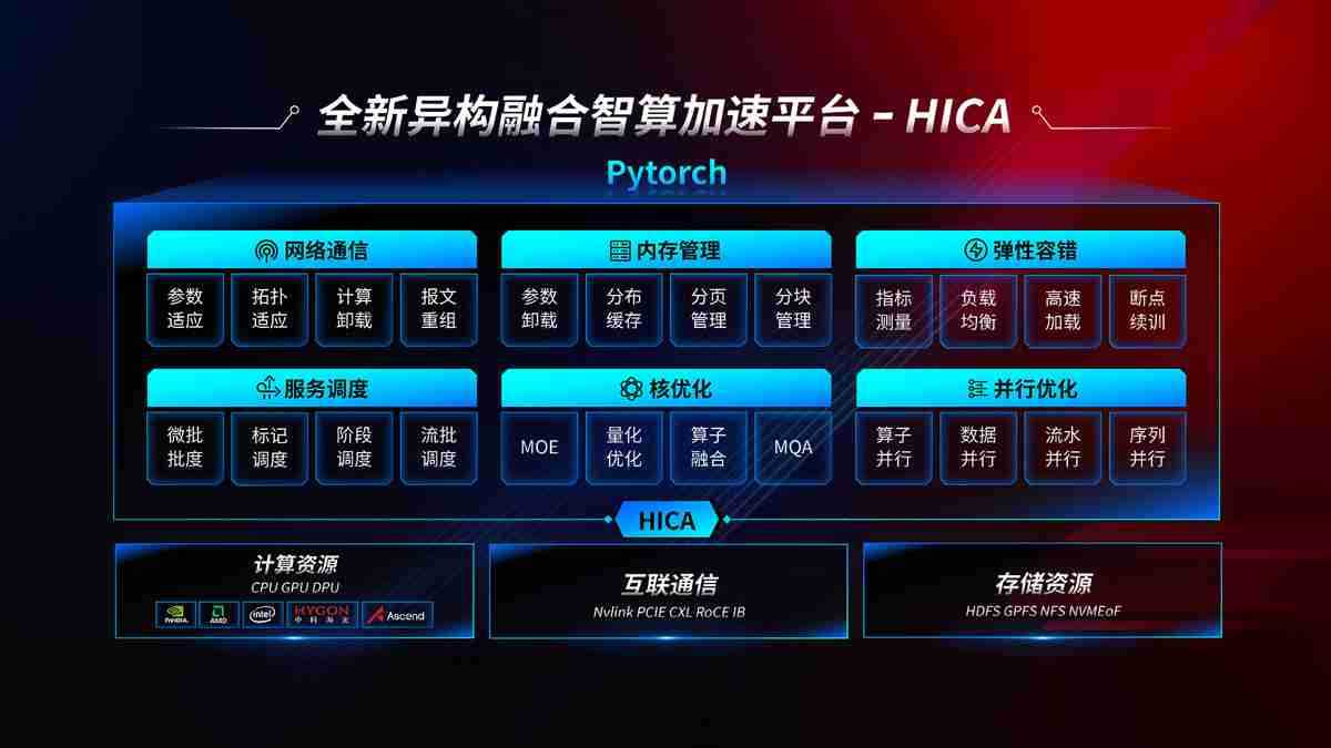 通过自研的服务层、、、、中间适配层、、以及调度编排算法,,,,采用数据并行、、、模型并行等多种并行方式,,把并行计算任务进行有效的分解,,,,使其分别由相应的软件栈和算力资源来承接。。。当GPU资源变化,,,,HICA可以实时动态调度计算子任务并调整模型拓扑和架构,,,以充分聚合各种算力资源。。。。