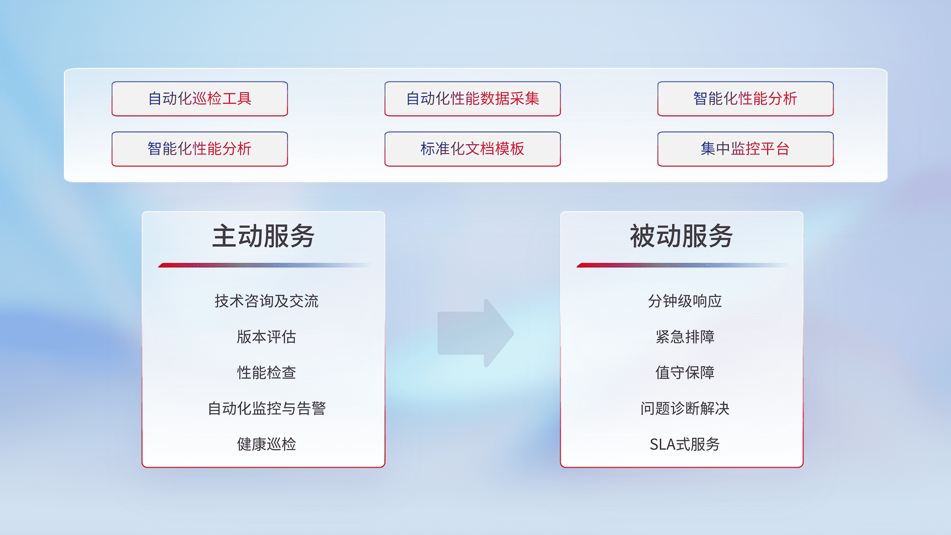 智能化工具和标准化文档,,,,保障服务质量,,提供主动服务(包含技术咨询、、、、版本评估、、性能检查、、、、自动化监控与告警、、健康巡检)和被动服务包含(分钟级响应、、紧急排障、、、值守保障、、问题诊断解决、、SLA服务)。。